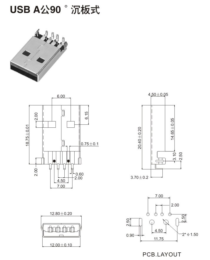 USB A公90° 沉板式